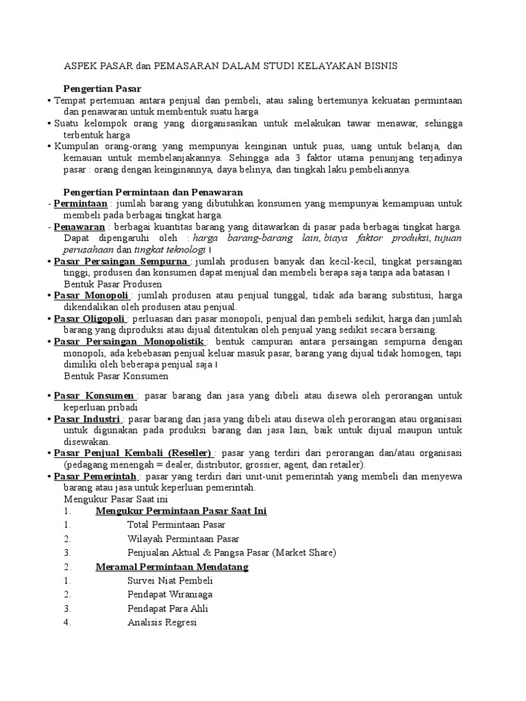 Bab ii aspek pasar dan pemasaran bentuk pasaruntuk memasarkan produk kami, maka telah ditentukan tujan pasar mana yang akan kami masuki, dalam hal ini ada 2 bentuk pasar, yaitu: Analisis aspek pasar “analisis aspek pasar” aspek pasar dalam studi kelayakan bisnis merupakan sebuah inti dari banyak aspek yang harus di susun dari sebuah rancangan studi kelayakan bisnis.hal ini berkaitan dengan permintaan pasar terhadap produk yang merupakan dimana akan berkaitan langsung dengan adanya penyediaan produk dari sebuah usaha yang akan di bangun. Tentunya, pihak pemberi jasa pembuatan studi kelayakan akan memeriksa semua lini usaha anda baik itu keuangan.